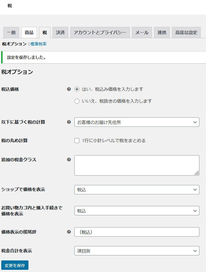WooCommerceの「設定」を開いて「税」タブを開くと「税込価格」とか「税の丸め計算」とかがある。これは「一般」の設定ということらしい。